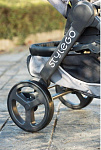 - Крупные задние колеса повышают проходимость, передние самоцентрирующиеся наделяют маневренностью. Гулять с крохой можно по самым загруженным улицам.