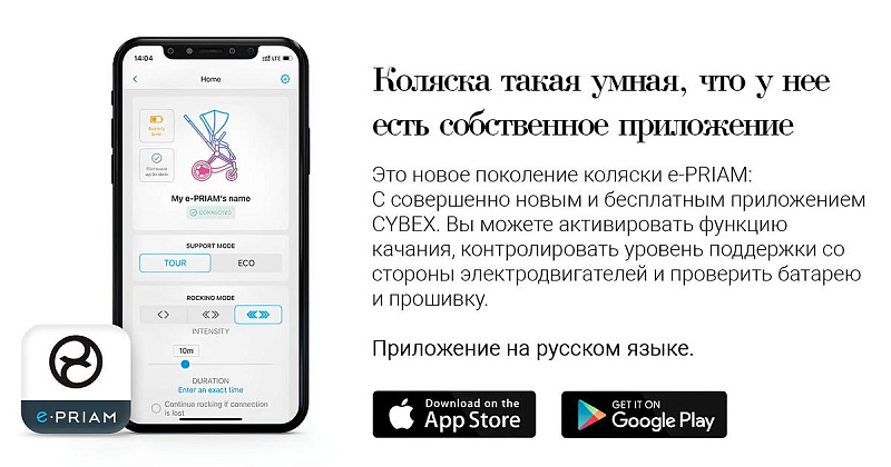 Кроме того, к модели Cybex E-Priam IV было добавлено приложение E-Priam, которое расширяет ее функциональность. Теперь с помощью этого приложения можно не только проверить уровень заряда батареи, но и активировать функцию качелей. Когда функция качелей включена, коляска начинает медленно двигаться вперед и назад, создавая мягкие укачивающие движения, которые помогают ребенку заснуть. Кроме того, можно выбрать один из трех уровней интенсивности, чтобы настроить качели подходящим образом.