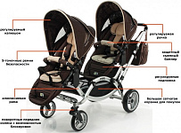 Прогулочный блокДля детей от 6 месяцев. Наклон сидения в 3 положениях до полностью горизонтального, подножка регулируется, бампер съемный, пятиточечные ремни с накладками, сиденья можно установить в разных направлениях. Капюшон регулируемый, со смотровым окошком.