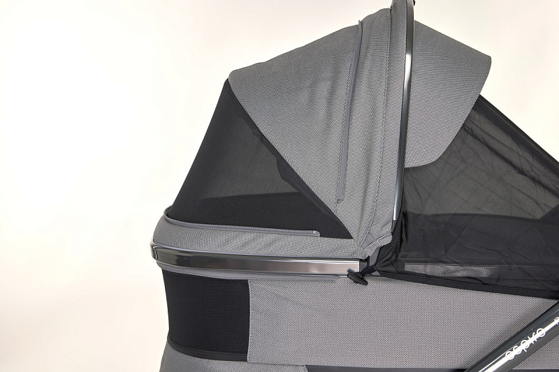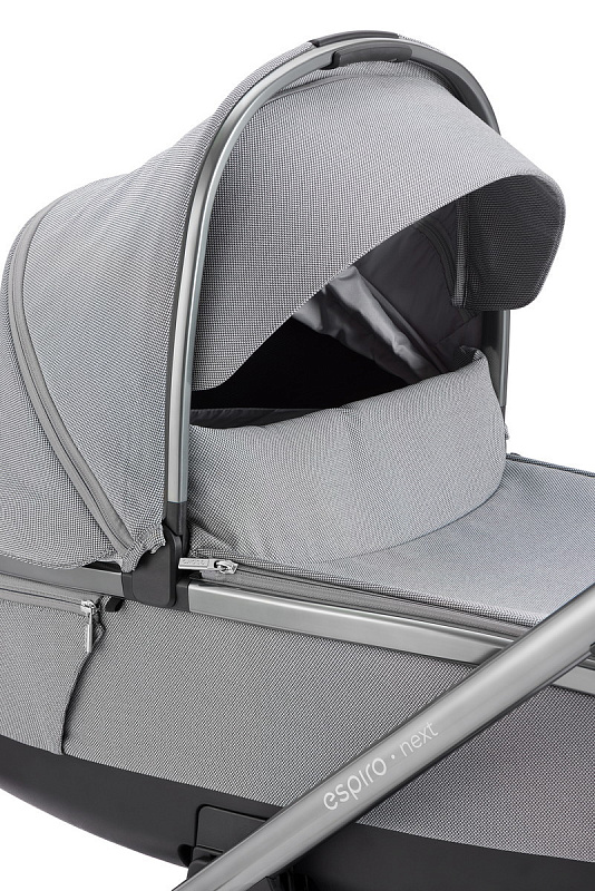 Люлька Espiro Next по-прежнему одна из самых комфортных на рынке за счет встроенной вентиляции и удобной внешней регулировки подголовника. Пользоваться ею можно в любую пору года. Капюшон надежный, удлиненный, есть высокий бортик на магнитах и накидка на ножки на молнии. В капюшон встроена москитная сетка. В нижней части спального модуля также имеется вентиляционная система.