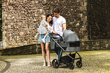 У спинки три положения наклона. В горизонтальном ребенок может спать на улице. Подножка удлиняет спальное место, для этого ее нужно приподнять. Капюшон закрывает малыша от внешнего воздействия. В капюшоне есть встроенная сетка, которую при необходимости можно спрятать в задний карман в капюшоне. Чтобы ребенок не выпал из коляски во время движения, предусмотрены 5-точечные ремни безопасности и съемный ограничитель. В комплект с прогулочным вариантом входит конверт-трансформер.