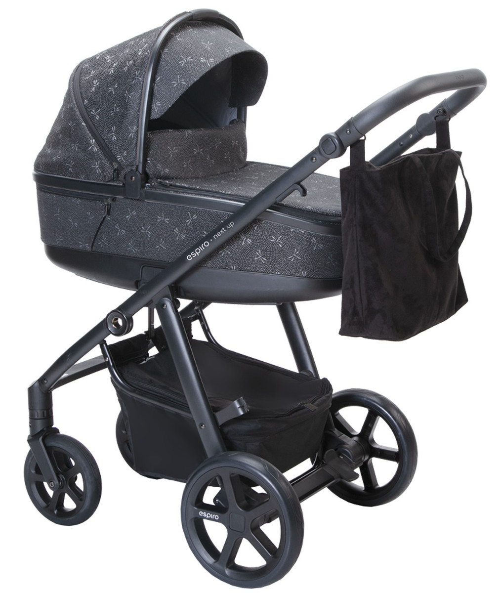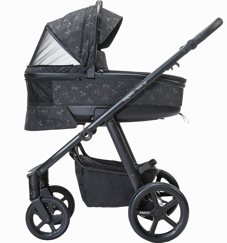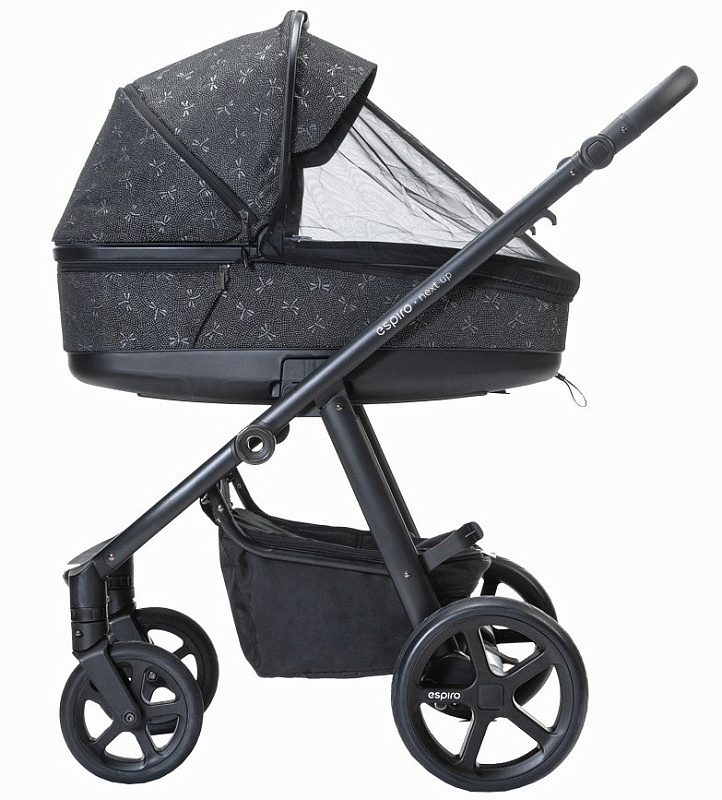 Espiro представляет уникальный красивый узор  в сочетании с элегантной черной матовой структурой рамы. В основе уникального принта - стрекоза. Во многих культурах стрекоза символизирует активность и перемены, ей присущи магические черты, аналогичные бабочке, — способность к метаморфозам, изменению и трансформации. Люлька Espiro Next – одна из самых инновационных и комфортных люлек на рынке: со встроенной системой вентиляции, удобной регулировкой подголовника. Люлька комфортна при любой погоде и в любой сезон. Основное обновление Espiro Next Up Limited Dragonfly коснулось прогулочного блока. Благодаря изменениям в дизайне сиденье стало более элегантным и легким. В обновленной версии вентиляция панорамная - полностью открывающая ребенка, обеспечивая максимально возможный тепловой комфорт во время сна. Это придало всей конструкции дополнительную легкость. Соответствующую легкость  дизайнеры придали и подставке для ног. Подставка для ног в предыдущей модели была сделана из эко-кожи. В модели Next Up подножка сделана из сетчатого материала  - это облегчает внешний вид и уход за коляской. Рама коляски изготовлена из алюминия и весит около 9 кг вместе с колесами. Складывается легко и компактно. После складывания его можно хранить в горизонтальном или вертикальном положении. Коляску можно сложить вместе с прогулочным сиденьем. В комплекте встроенные москитные сетки, 2 дождевика, сумка длямамы, конверт-трансформер, подстаканник, матрасик.