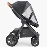 Прогулочный блок оснащён капюшоном до бампера. Бампер с разделителем для ног и пятиточечные ремни с мягкими накладками надёжно фиксируют малыша в коляске. Положение спинки и подножки можно отрегулировать.