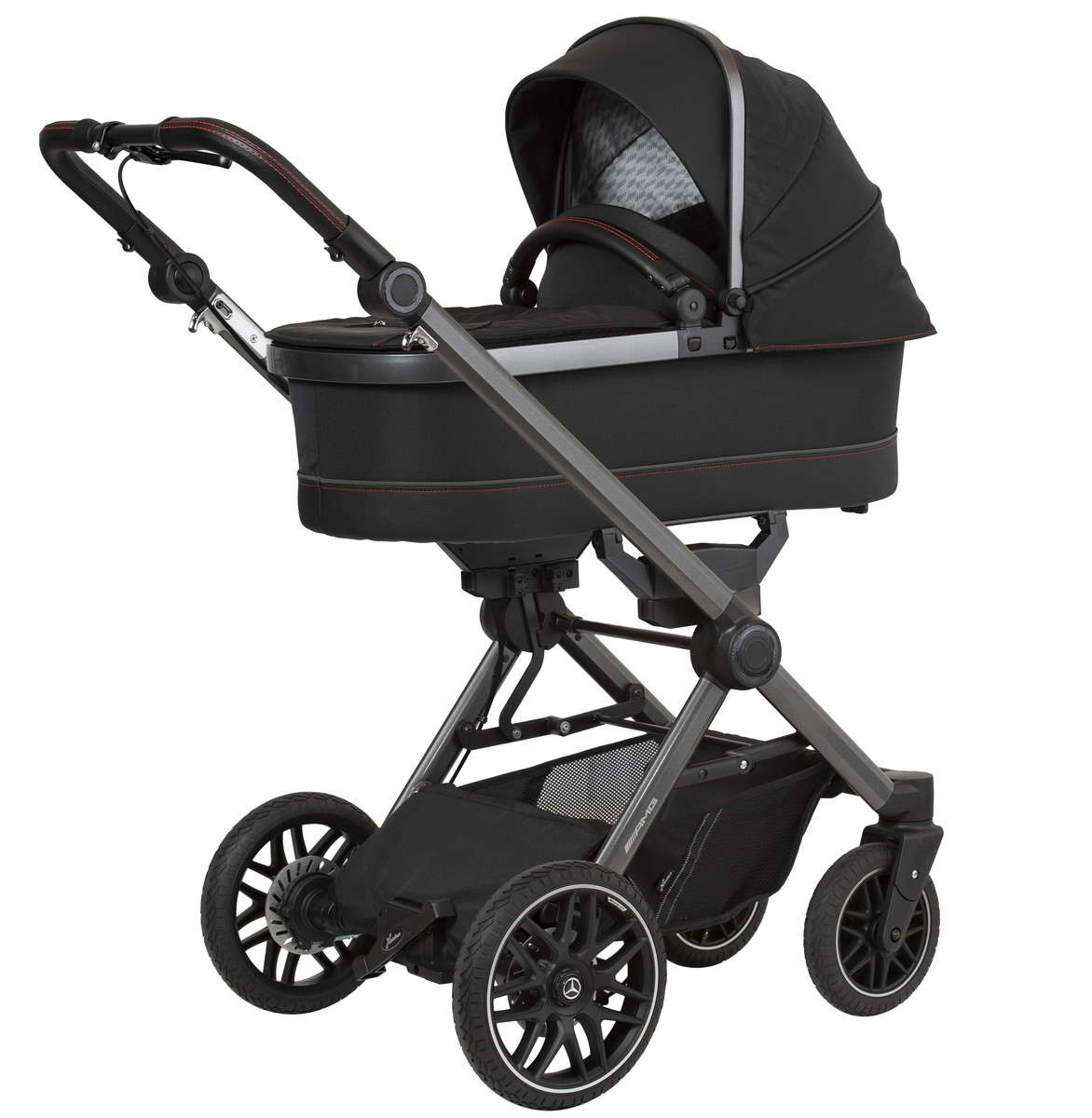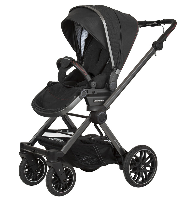 - 5-спицевые колеса коляски выполнены в дизайне amg, как у настоящих спорткаров