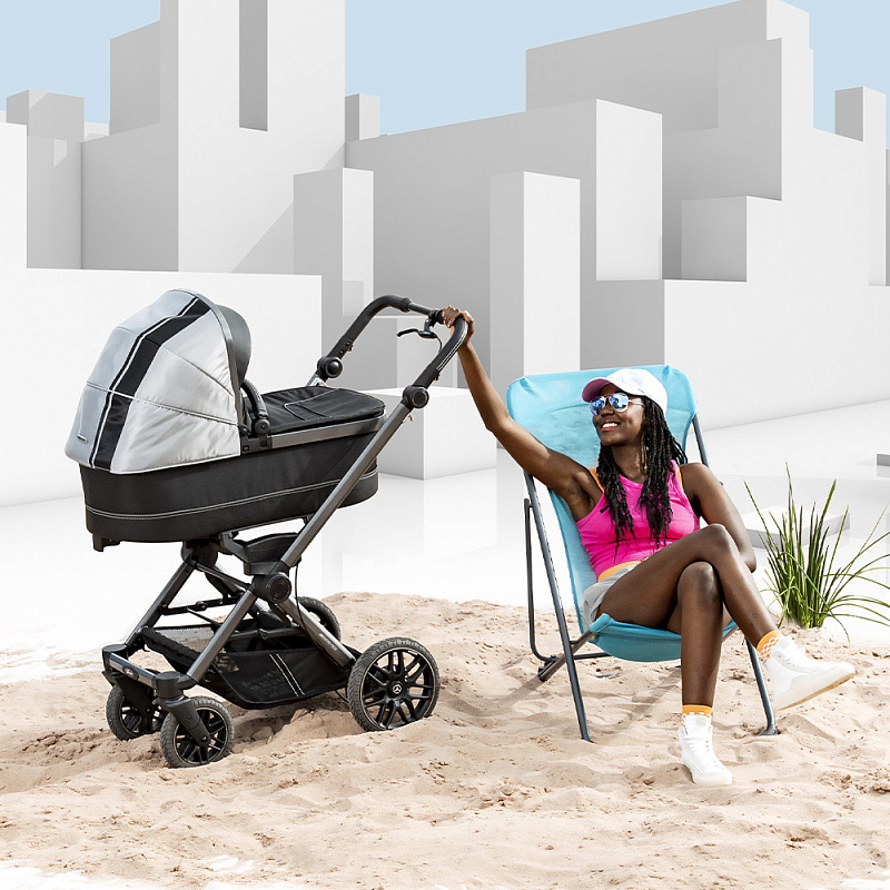 - капюшон бесшумно регулируется в 3 положениях и поможет защитить от яркого солнца. В капюшоне есть окошко для регуляции температуры, проветривания и наблюдения за малышом