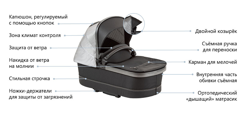 - климат-контроль: зона вентиляции (сетка) капюшона для поддержания оптимальной температуры, проветривания и наблюдения за малышом