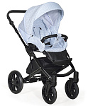 Рама коляски складывается как книжка и со снятыми колесами без проблем поместится в багажник автомобиля. Передние поворотные колеса при желании можно зафиксировать. Колеса у коляски резиновые надувные - вместе с регулируемыми пружинными амортизаторами обеспечивают плавный убаюкивающий ход. Регулируемая кожаная ручка подстраивается под рост родителя и приятна на ощупь. Блоки на раме можно устанавливать как лицом к маме, так и по ходу движения - с системой One Touch это займет минимум времени и усилий. Центральный тормоз фиксирует коляску одним нажатием педали. Для багажа предусмотрена закрытая текстильная сумка.