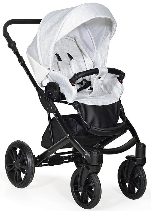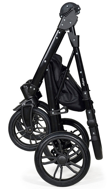 Рама коляски складывается как книжка и со снятыми колесами без проблем поместится в багажник автомобиля. Передние поворотные колеса при желании можно зафиксировать. Колеса у коляски резиновые надувные - вместе с регулируемыми пружинными амортизаторами обеспечивают плавный убаюкивающий ход. Регулируемая кожаная ручка подстраивается под рост родителя и приятна на ощупь. Блоки на раме можно устанавливать как лицом к маме, так и по ходу движения - с системой One Touch это займет минимум времени и усилий. Центральный тормоз фиксирует коляску одним нажатием педали. Для багажа предусмотрена закрытая текстильная сумка.