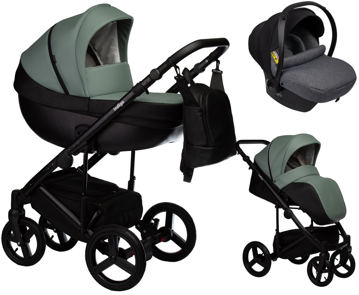 Детская коляска Indigo Tour Eco 3 в 1 с автокреслом Avionaut Cosmo Grey Te03 черная кожа+шалфей кожа