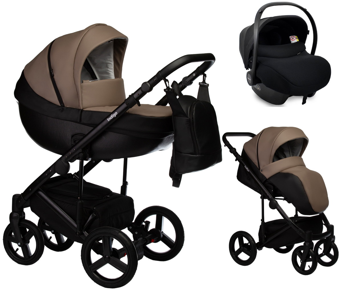 Детская коляска Indigo Tour Eco 3 в 1 с автокреслом Avionaut Cosmo Black Te04 черная кожа+т.бежевая кожа