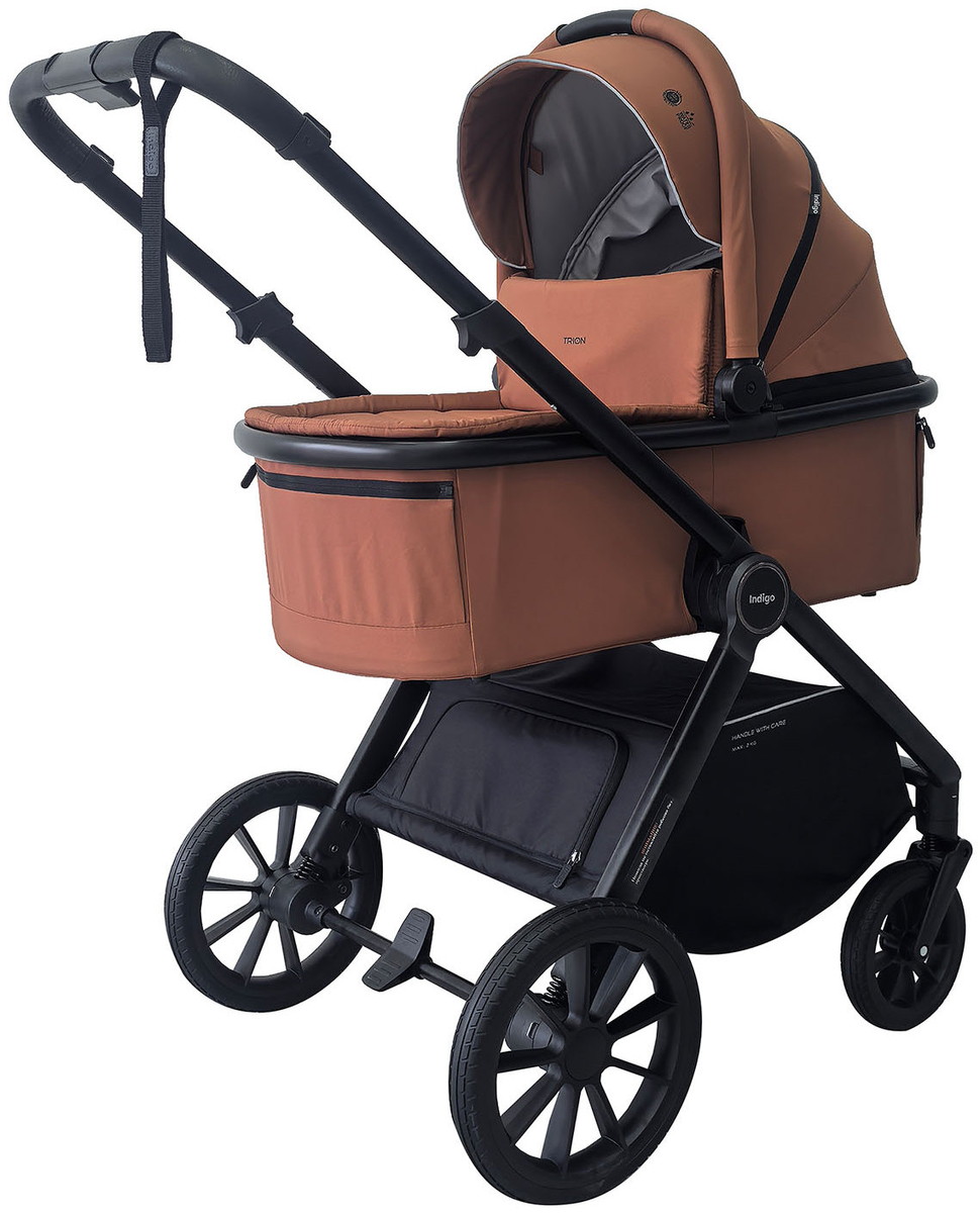 Коляска TRION 3 в 1 от бренда Indigo — универсальная модель с тремя модулями: люлькой для новорожденного, прогулочным блоком и люлькой-переноской.
