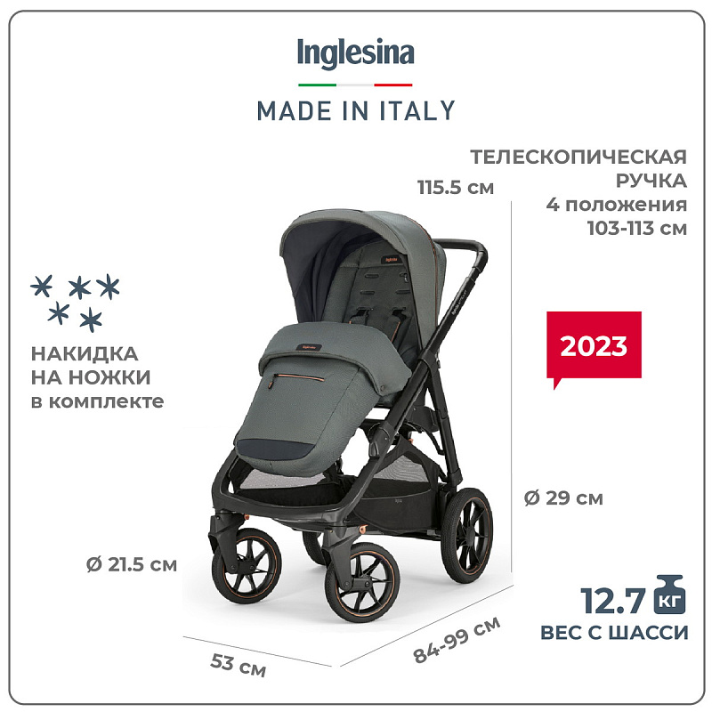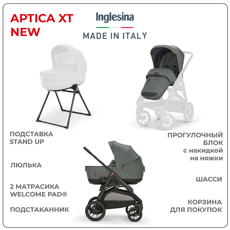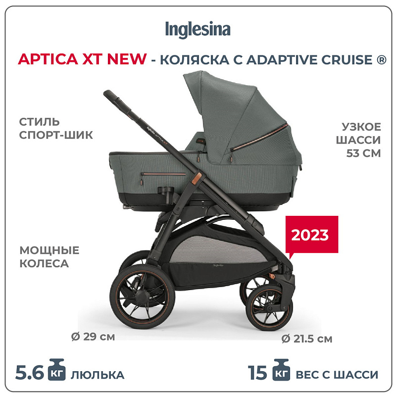 Aptica 2 в 1 XT New – эволюция легендарного флагмана бренда Inglesina в стиле «спорт-шик». Коляска высокой проходимости стала легче и маневреннее благодаря модернизации люльки, прогулочного блока и уникального шасси XT. Современный дизайн, технологичные влагонепроницаемые ткани, герметичные молнии и глубокий капюшон, устойчивый к порывам ветра.