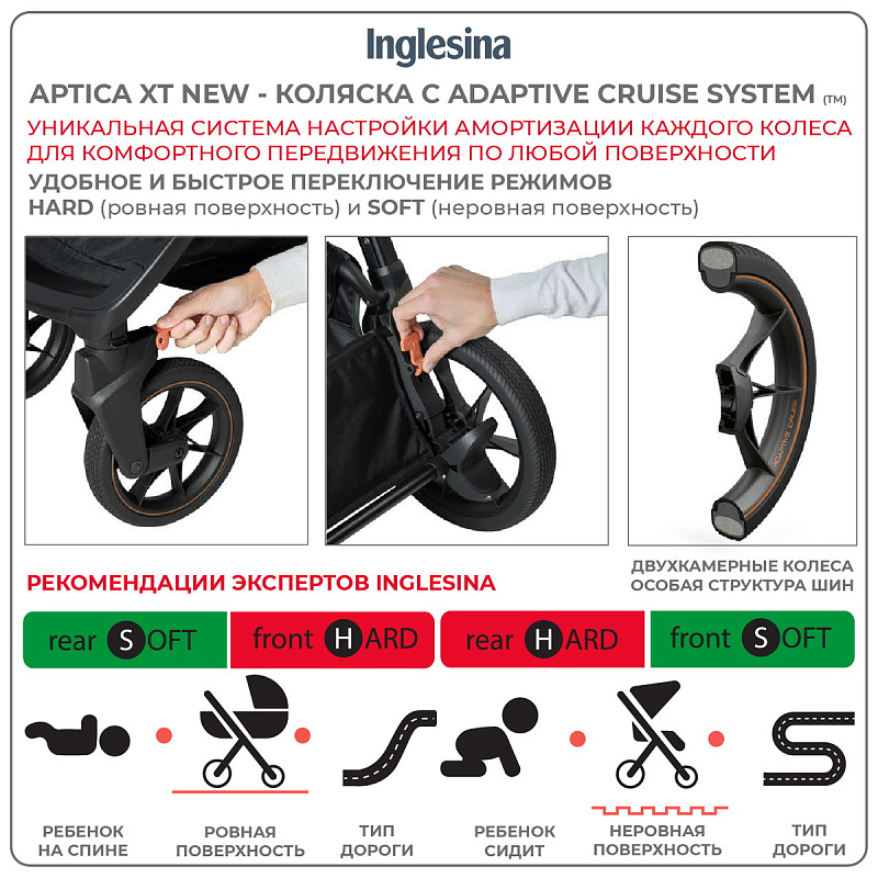 Aptica 2 в 1 XT New оснащена Adaptive Cruise System –система настройки амортизации каждого колеса в зависимости от типа покрытия и возраста ребенка. Коляска легко и плавно передвигается по любой поверхности. Положение HARD/SOFT на каждом колесе для быстрого переключения мягкости амортизации.