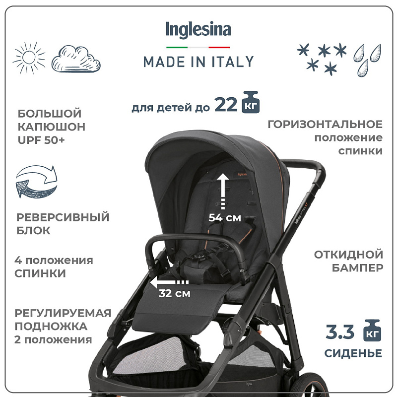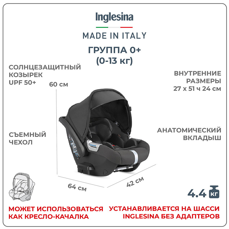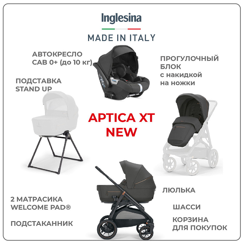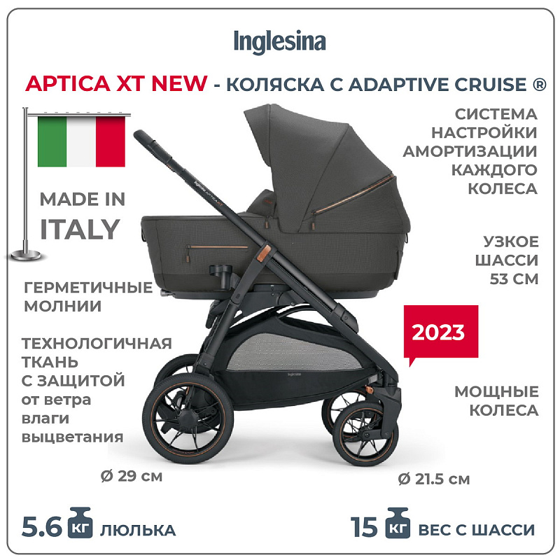 Aptica 3 в 1 XT New – эволюция легендарного флагмана бренда Inglesina в стиле «спорт-шик». Коляска высокой проходимости стала легче и маневреннее благодаря модернизации люльки, прогулочного блока и уникального шасси XT. Современный дизайн, технологичные влагонепроницаемые ткани, герметичные молнии и глубокий капюшон, устойчивый к порывам ветра.