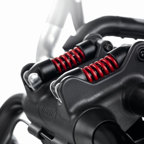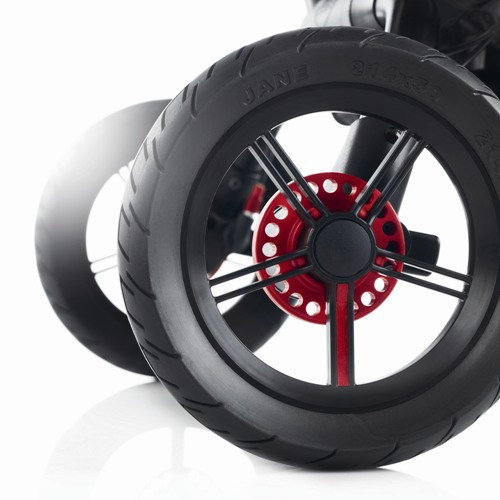 - Система амортизации регулируемая, что в дополнение с передними поворотными колесами гарантирует отличную проходимость и маневренность.