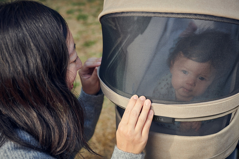- Регулируемый большой капюшон (UPF50+) с сетчатой вставкой и петлями для игрушек