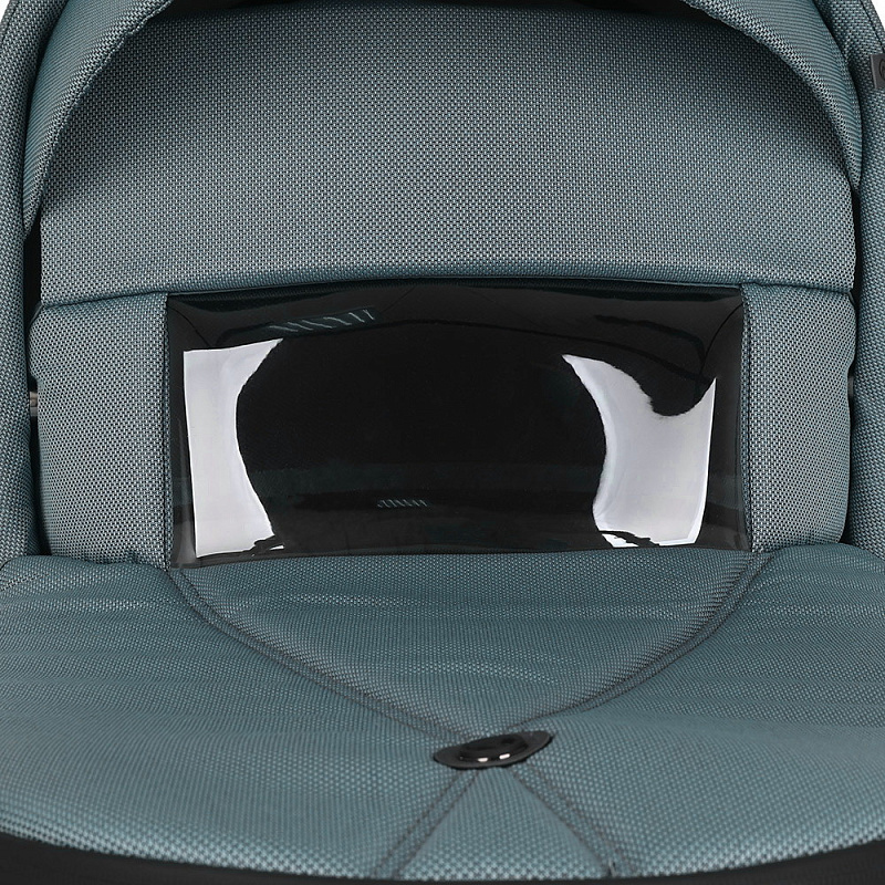 - Капор имеет жёсткое крепление к люльке, на нём находится ручка для переноски люльки, в раскрытом положении он фиксируется, для сложения необходимо нажать кнопки с двух сторон. В капор встроена антимоскитная сетка и дополнительный козырёк для защиты от солнца и дождя