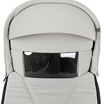 Накидка на люльку имеет дополнительный отворот со смотровым окном, сам отворот полностью закрывает ребенка от непогоды и крепится за счёт магнитов.