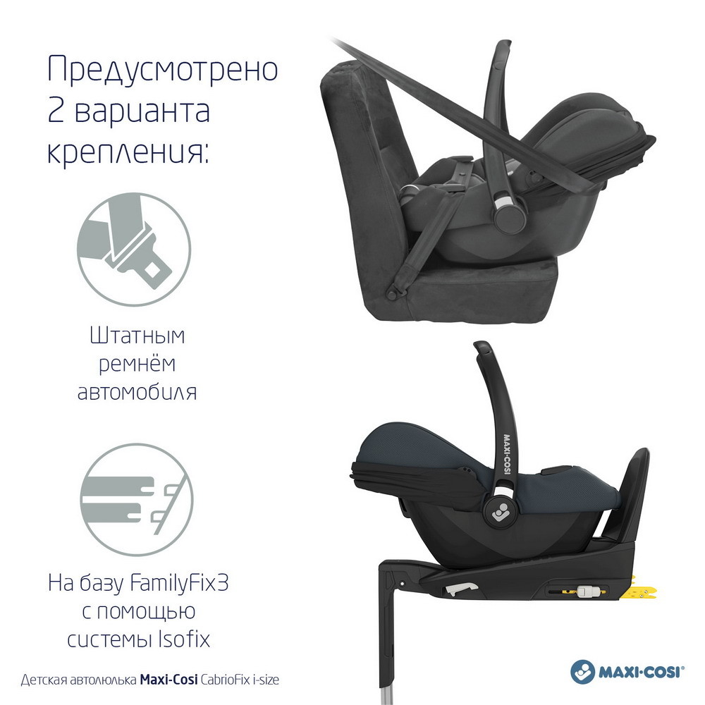 CabrioFix i-Size - это идеальное автокресло для начала путешествия вашего ребенка. CabrioFix i-Size соответствует самым высоким стандартам безопасности, сертифицирована по новому стандарту i-Size! CabrioFix i-Size устанавливается на базу и снимается с базы в один клик (база в комплектацию не входит).