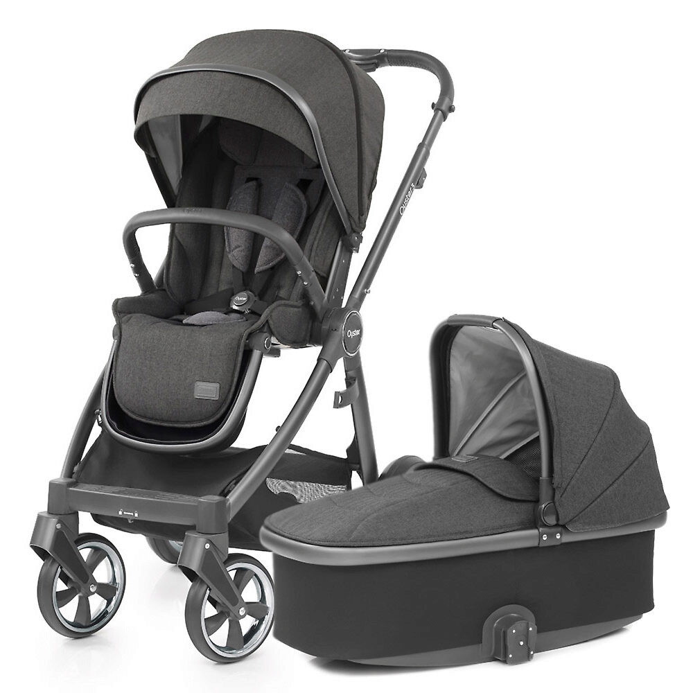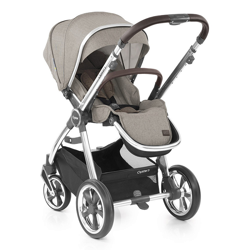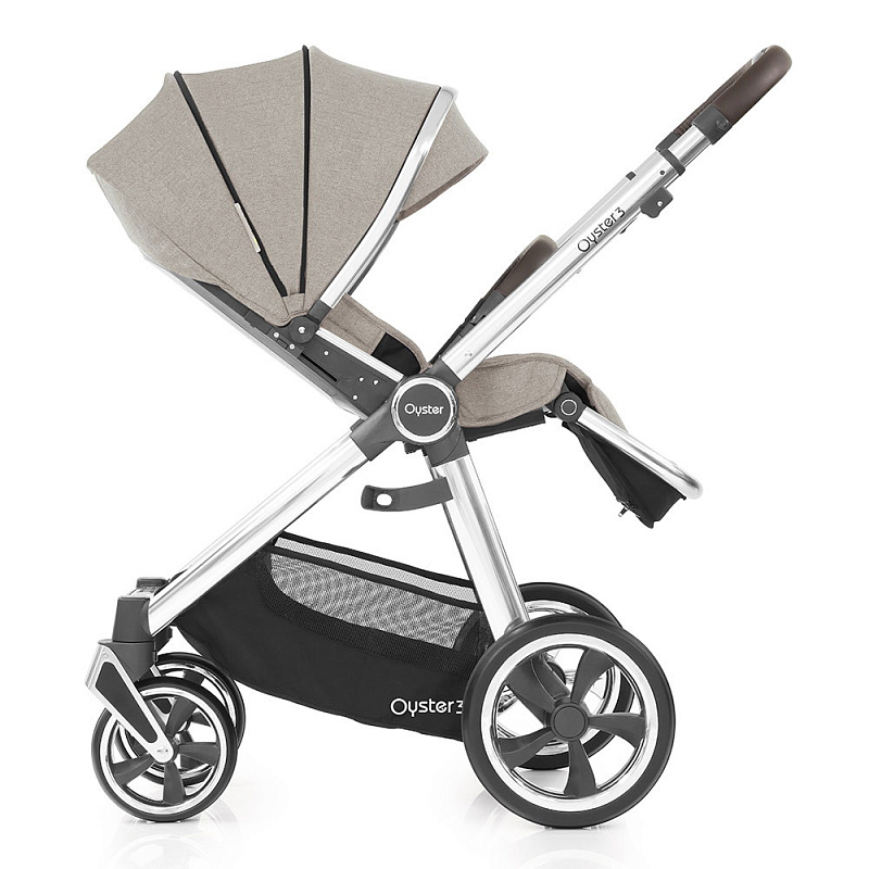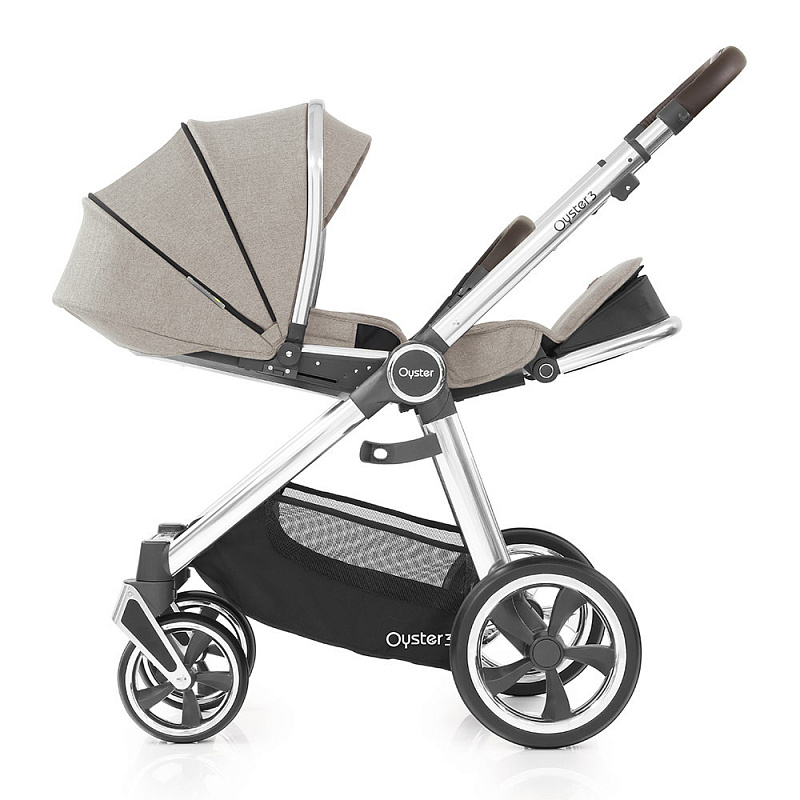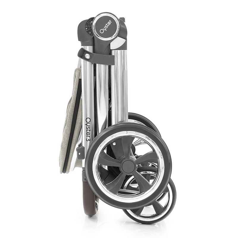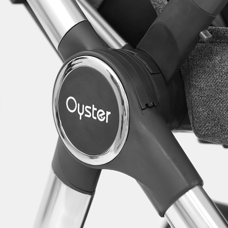 Телескопическая ручка для родителей плавно регулируется по высоте нажатием кнопки. Она покрыта экокожей, приятной на ощупь. Oyster 3 складывается быстро, без усилий, вместе с прогулочным блоком, установленным в любую сторону. В собранном виде занимает мало места, стоит без опоры, для более компактного хранения колёса можно снять. Под сиденьем находится большая вместительная корзина с лёгким доступом. Коляска Oyster 3 в комплектации 2 в 1 выполнена из качественных материалов, соответствует европейским сертификатам безопасности.