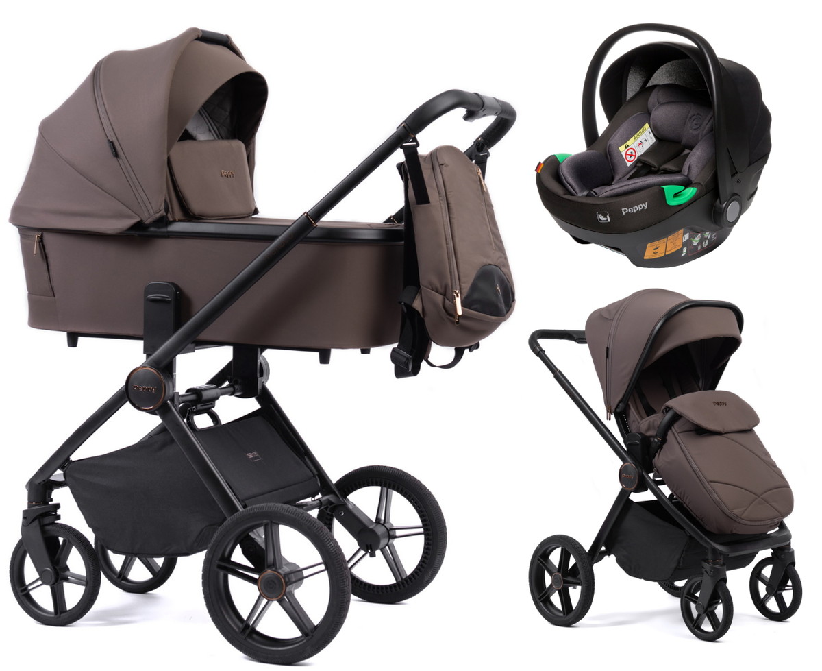 Детская коляска Peppy Monaco 3 в 1 с автокреслом First Brownie коричневый, рама черная