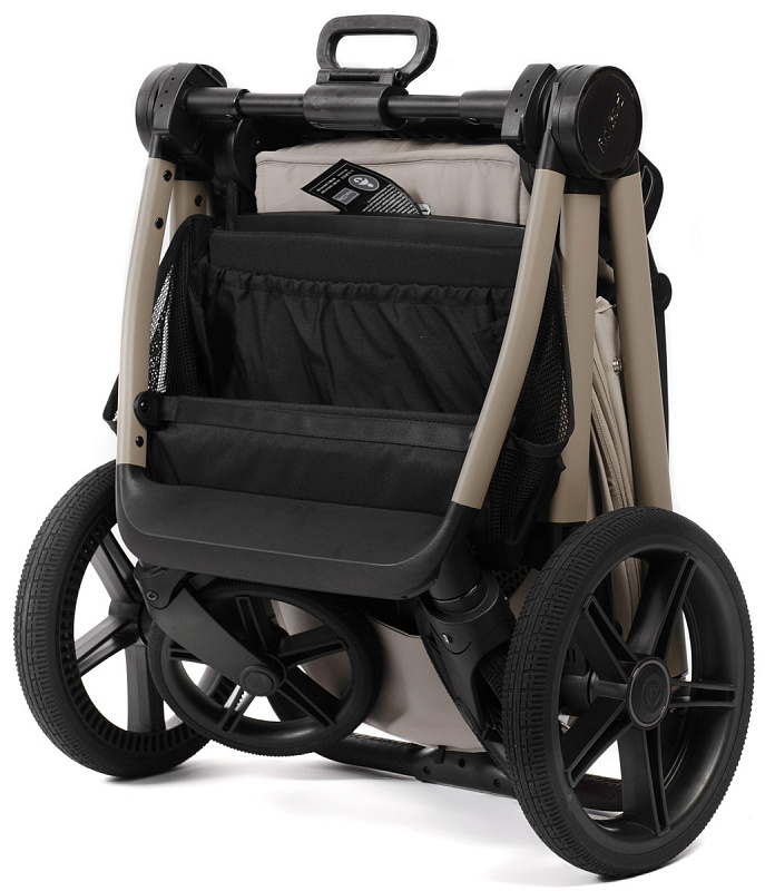Шасси складывается с помощью ручки над корзиной. Складывание рамы с прогулочным блоком возможно в любом направлении;