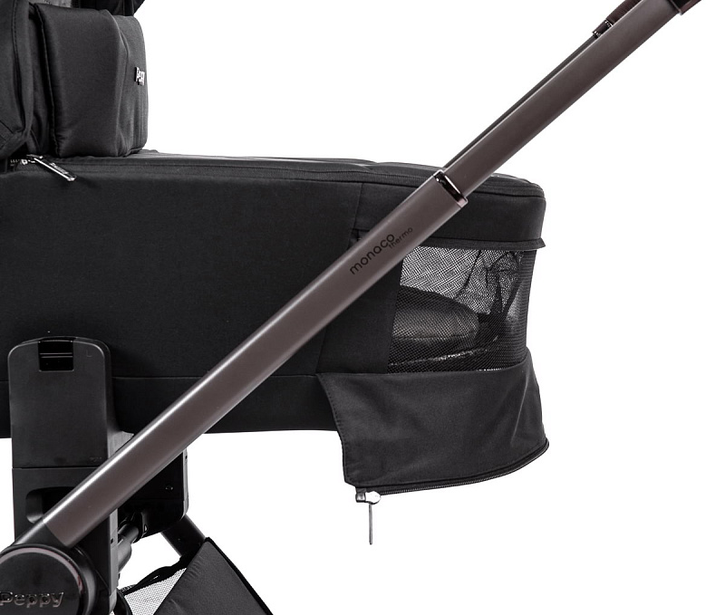 Peppy Monaco укомплектована вместительной корзиной, которая увеличивается в размерах и оснащена двумя дополнительными карманами для мелочей, где удобно спрятать москитную сетку;