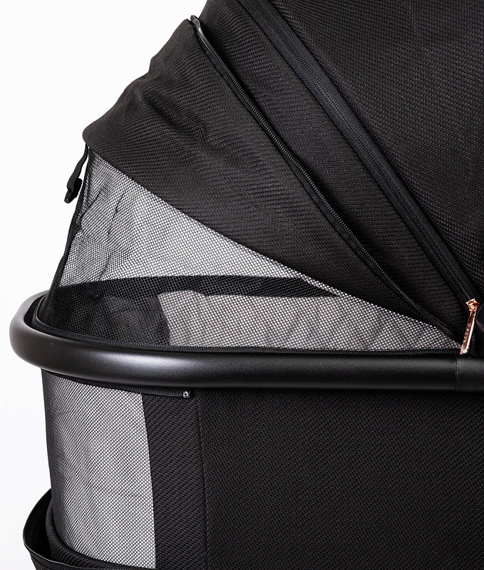 Для лучшей циркуляции воздуха в жаркие летние дни в капоре люльки и у изголовья есть москитная сетка, спрятанная под молнией
