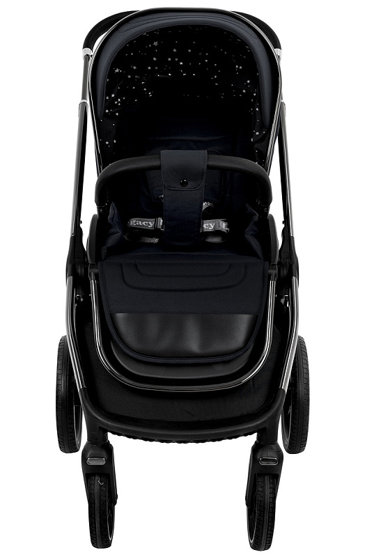 Рама из облегченного алюминия с покрытием Black Chrome имеет повышенную износостойкость и компактно складывается по типу "книжки" вместе с прогулочным блоком.