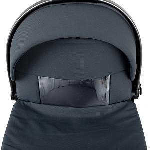 Капор люльки оборудован ручкой для переноски, имеется съемный козырек, дополнительная секция, климатическое окно под молнией в корпусе люльки и в капюшоне.