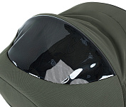 Капор люльки оборудован ручкой для переноски, имеется съемный козырек, дополнительная секция, климатическое окно под молнией в корпусе люльки и в капюшоне.