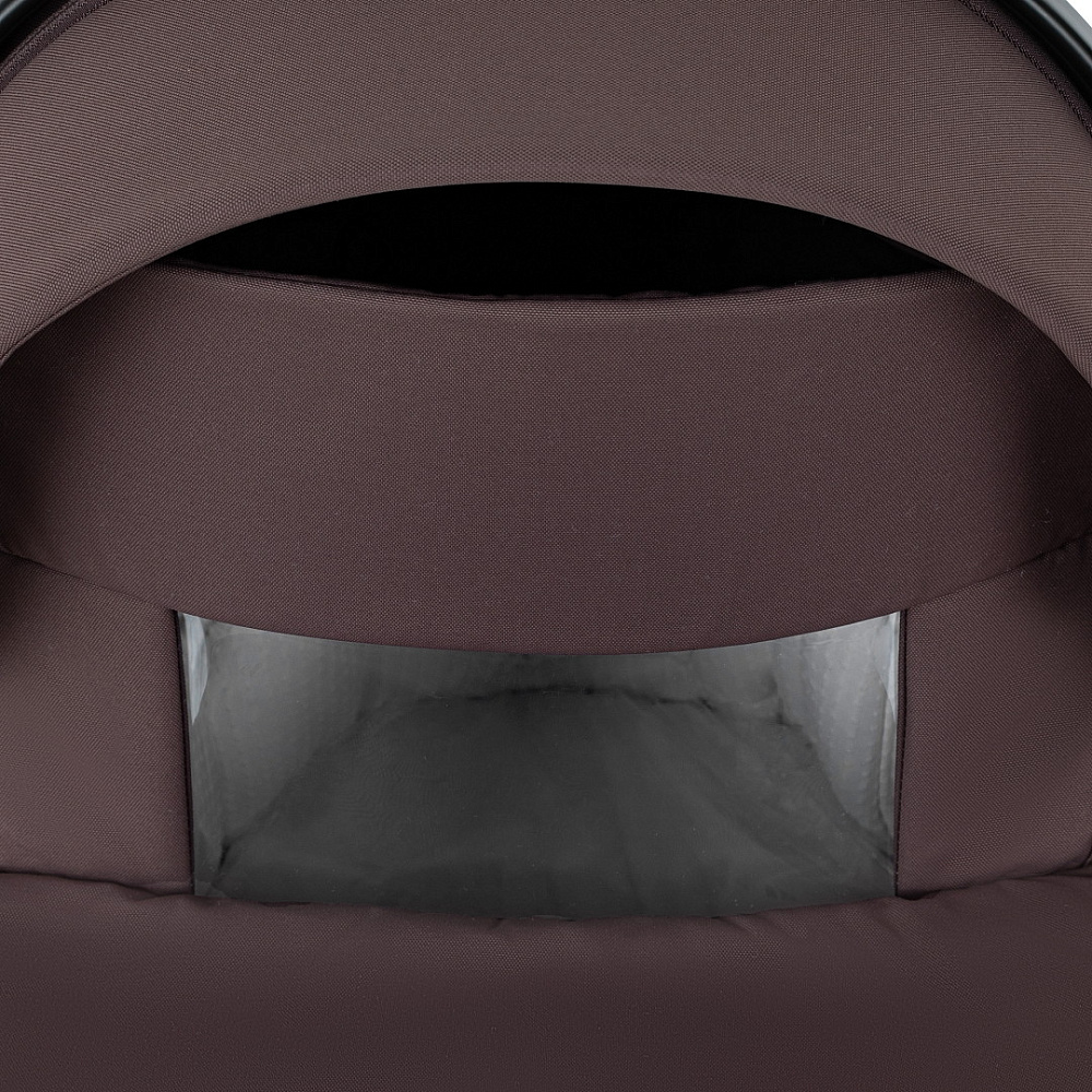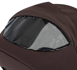 Капор люльки оборудован ручкой для переноски, имеется съемный козырек, дополнительная секция, климатическое окно под молнией в корпусе люльки и в капюшоне.