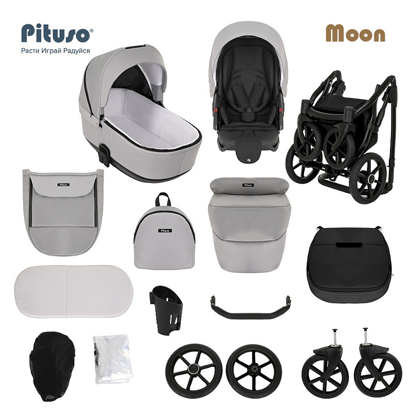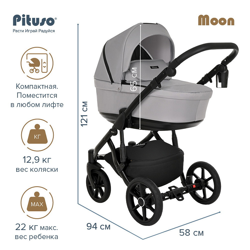 Новинка 2022 года! Коляска PITUSO MOON -Новая облегченная люлька из инновационного композитного материала, который обеспечивает отличную термо- и звукоизоляцию, и при этом обладает весом 4,6 кг. Прогулочный блок коляски MOON имеет удлиненную подножку, увеличенный капюшон. Неоспоримым преимуществом данной модели коляски является возможность раму (шасси) коляски сложить вместе с прогулочным блоком, что облегчает транспортировку.