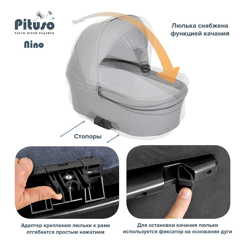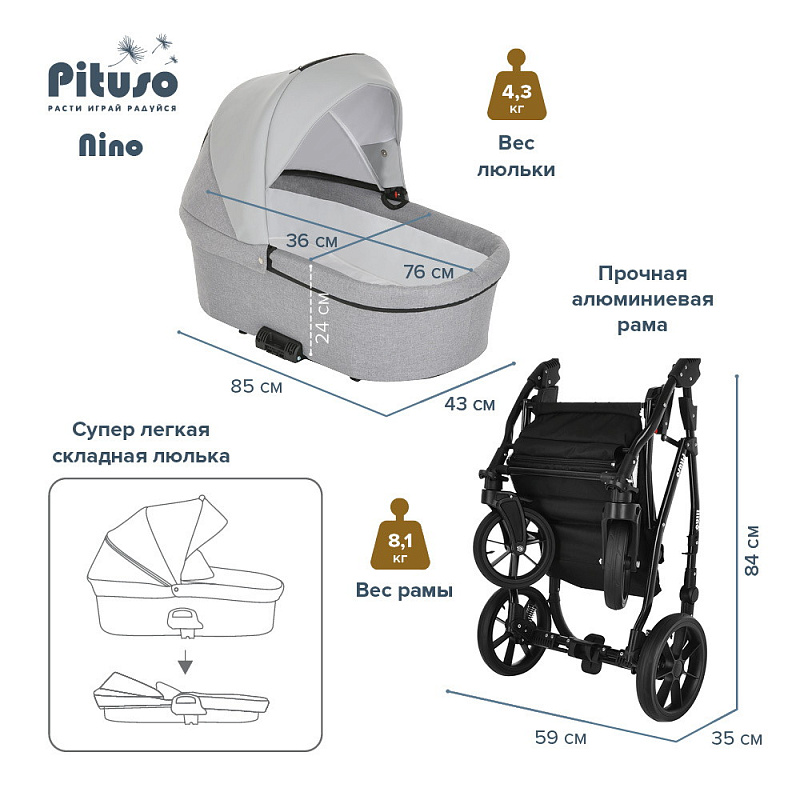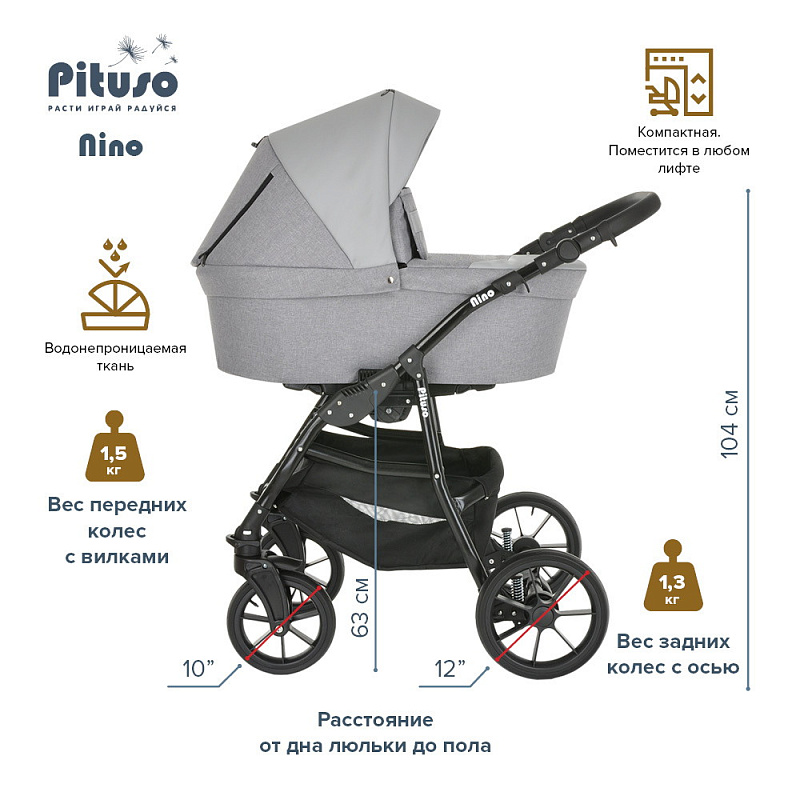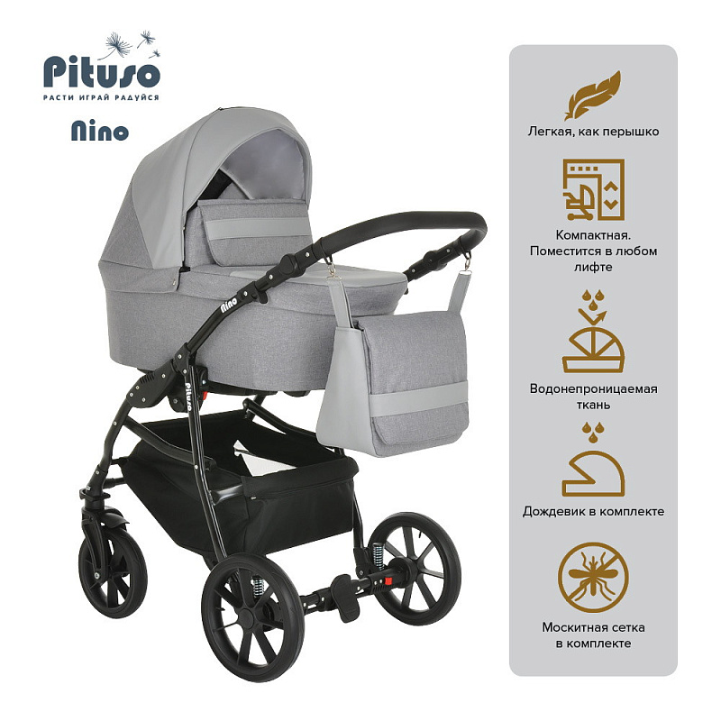 Коляска PITUSO NINO - покорит сердца молодых родителей своей практичностью и комфортом. Модель отличается стильным и современным дизайном, скромными габаритами и сравнительно небольшим весом