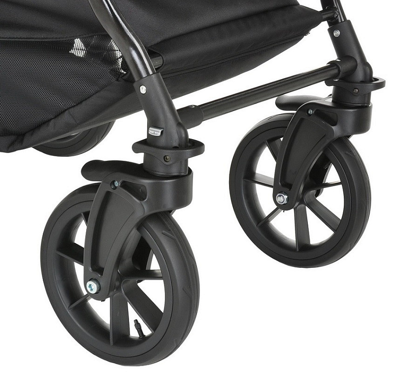 - Наличие амортизации на колесах позволяет осуществлять прогулки даже по проселочным дорогам, а гелевые колеса на подшипниках позволят с легкостью справиться с переездом бордюр и без особых затруднений проедут по заснеженной тропе.
