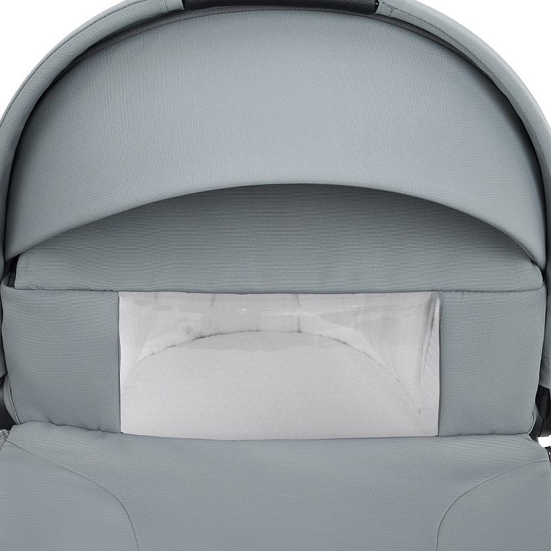 Капор люльки оборудован ручкой для переноски, имеется съемный козырек, дополнительная секция, климатическое окно под молнией в корпусе люльки и в капюшоне.