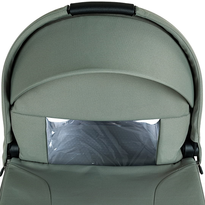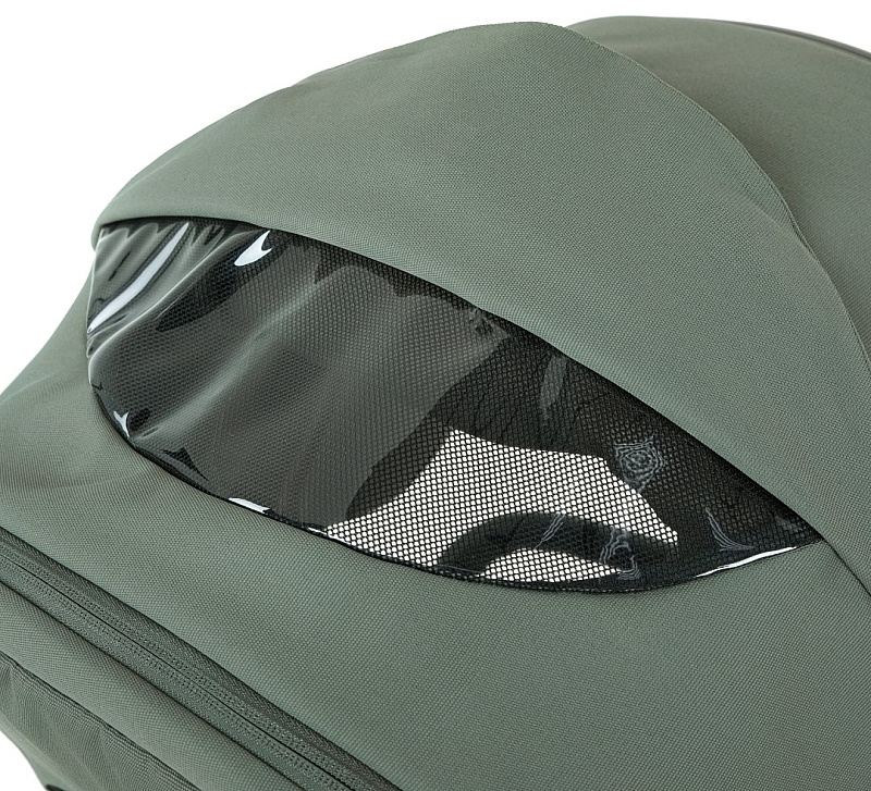 Капор люльки оборудован ручкой для переноски, имеется съемный козырек, дополнительная секция, климатическое окно под молнией в корпусе люльки и в капюшоне.