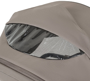 Капор люльки оборудован ручкой для переноски, имеется съемный козырек, дополнительная секция, климатическое окно под молнией в корпусе люльки и в капюшоне.