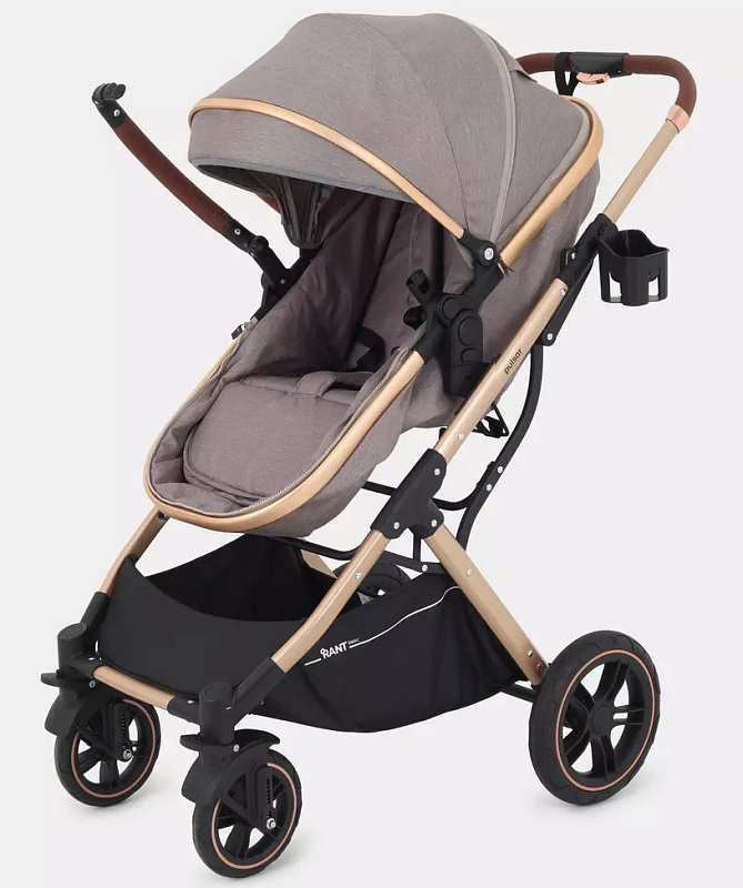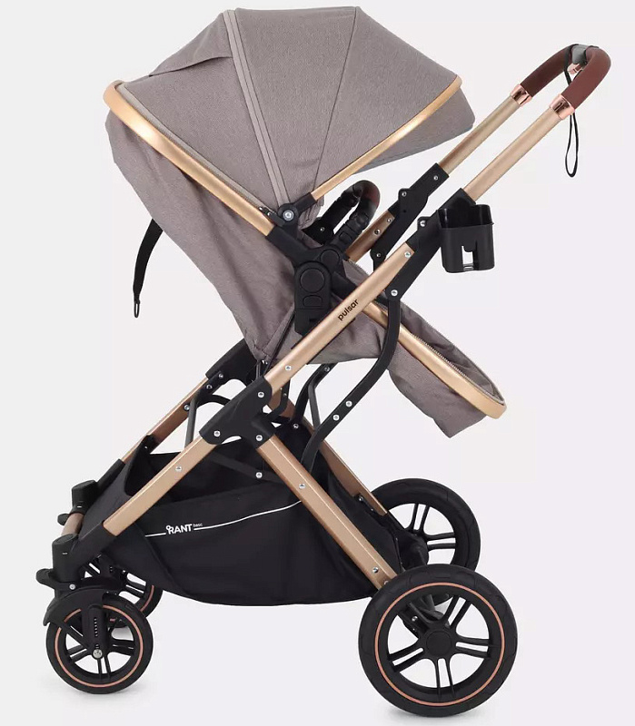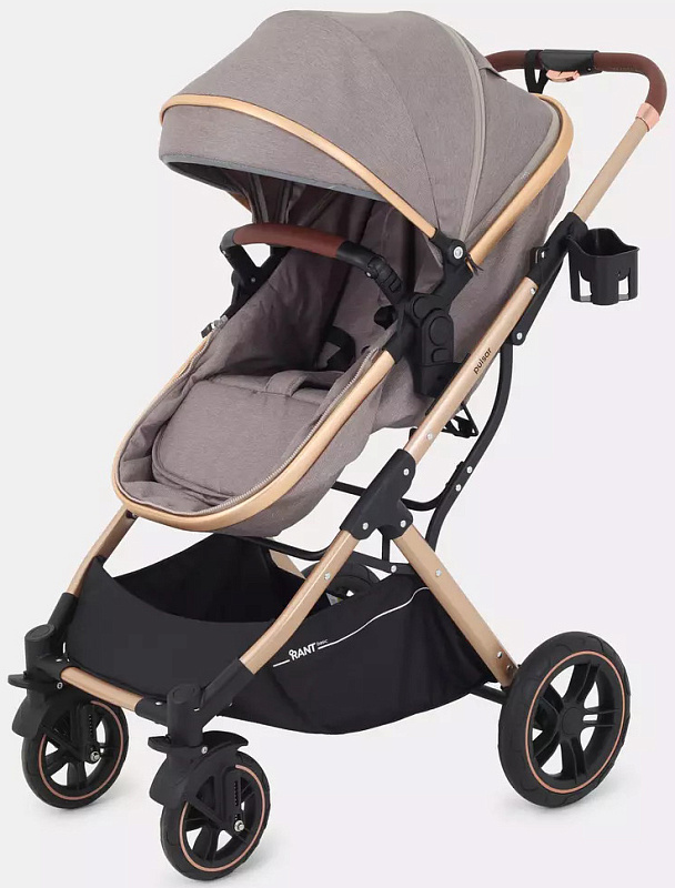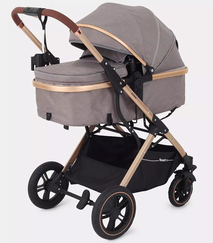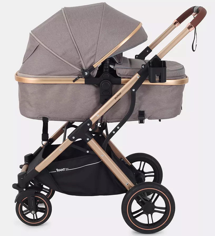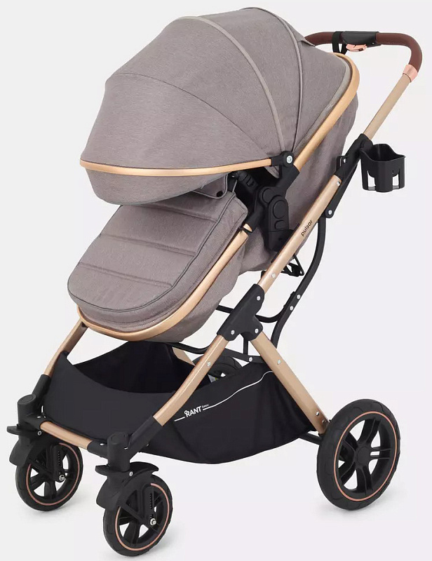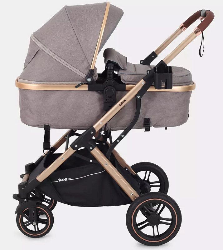 Детская коляска-трансформер Rant basic Pulsar Gold - эргономичная и вместительная! Особенности модели: трансформация в два движения; реверсивный блок; подстаканник для любимых напитков; тормоз-"качелька", не пачкающий обувь.