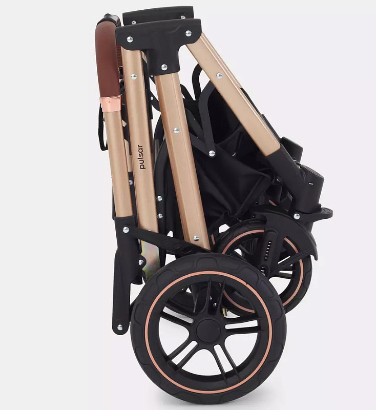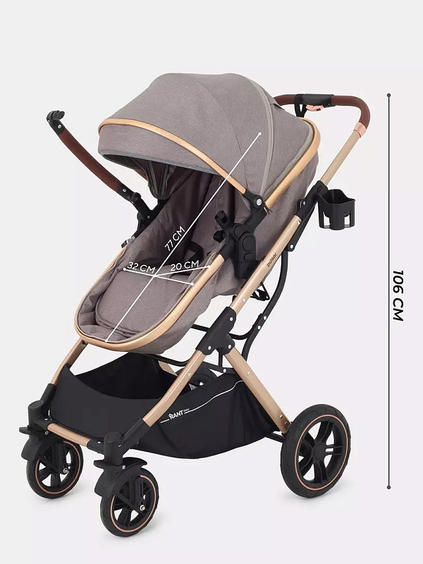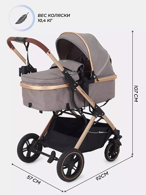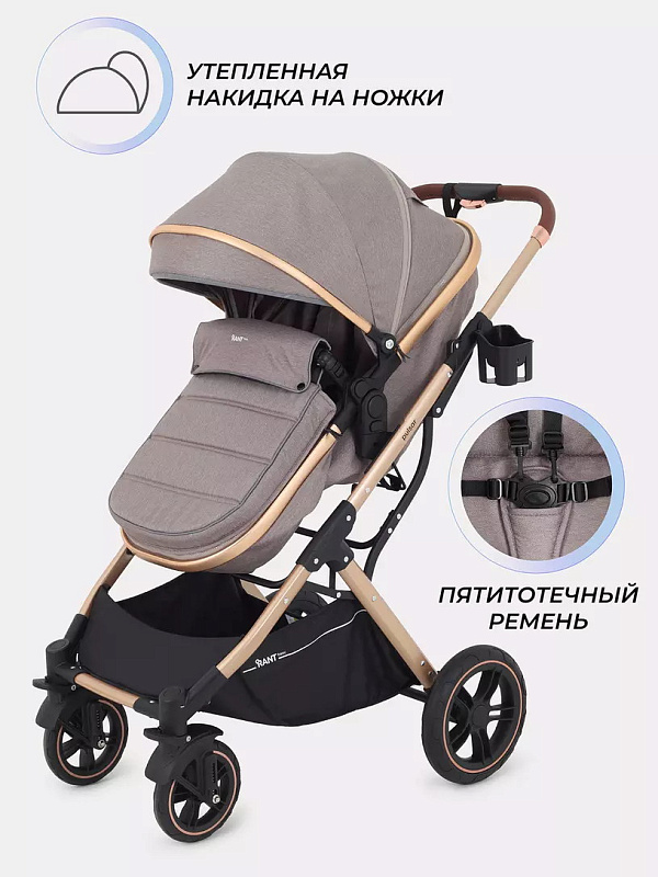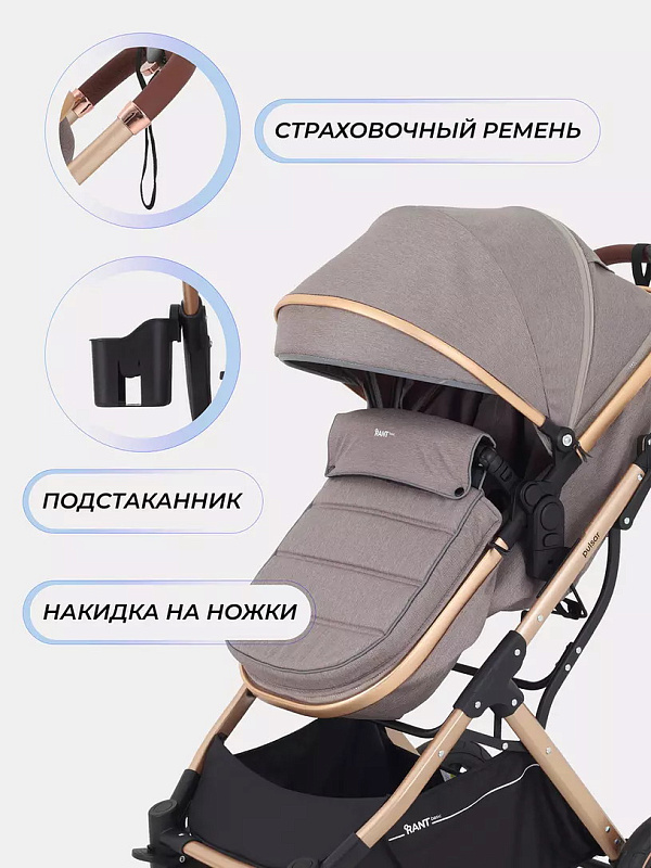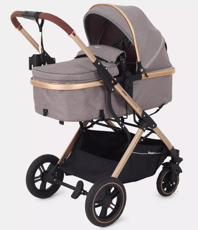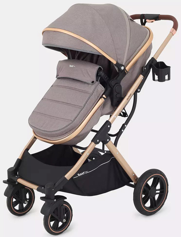Детская коляска-трансформер Rant basic Pulsar Gold - эргономичная и вместительная! Особенности модели: трансформация в два движения; реверсивный блок; подстаканник для любимых напитков; тормоз-"качелька", не пачкающий обувь.
