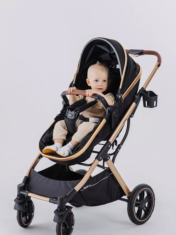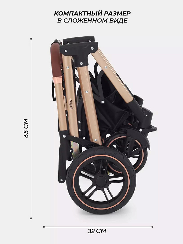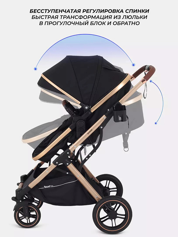 Детская коляска-трансформер Rant basic Pulsar Gold - эргономичная и вместительная! Особенности модели: трансформация в два движения; реверсивный блок; подстаканник для любимых напитков; тормоз-"качелька", не пачкающий обувь.