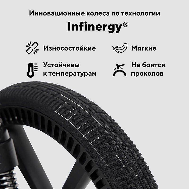 Инновационные полимерные колеса, не уступающие по мягкости надувным, но более долговечные и простые в обслуживании. Они отлично амортизируют, поглощая неровности дороги, обеспечивая мягкий и тихий ход. Передние поворотные колеса делают управление коляской легким и приятным.