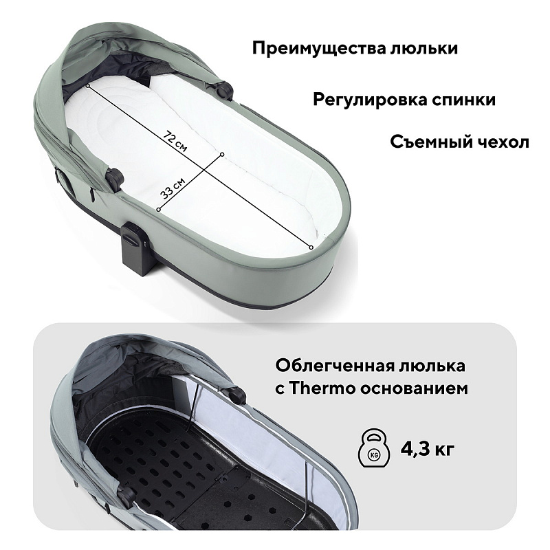 Термолюлька: дно выполнено из специального материала — лёгкое, прочное и термоизолирующее. Обеспечивает комфорт в любую погоду: летом не перегревается, сохраняет циркуляцию воздуха; зимой сохраняет тепло. Подойдёт как для прогулок, так и как временная кроватка при посещении гостей.