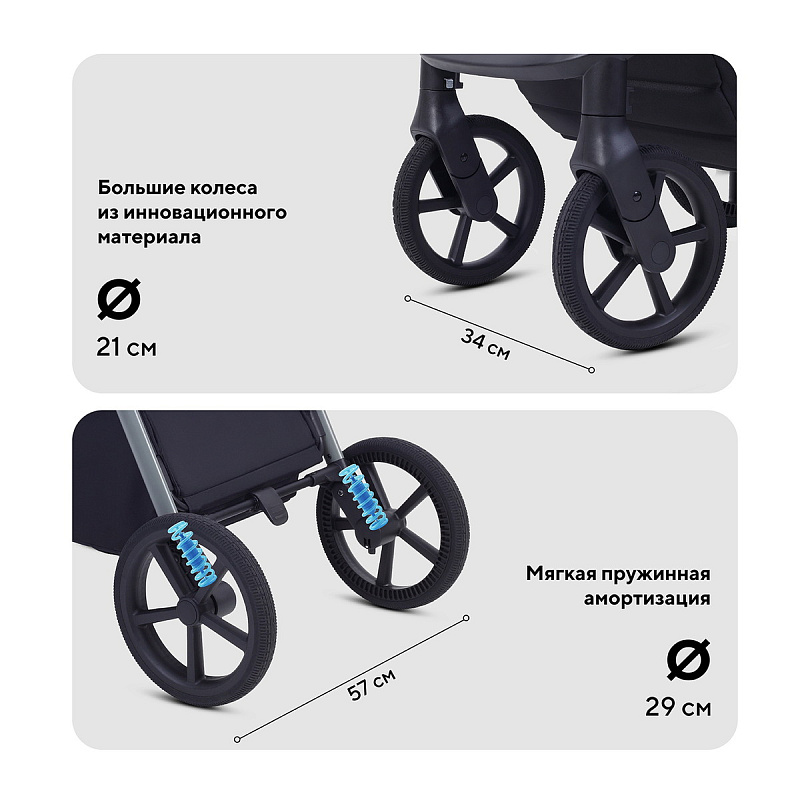 Супермягкая амортизация: коляска «плывёт по дороге», помогая продлить сон ребёнка на улице и делая управление лёгким и приятным.