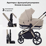 Модульность: в комплекте — люлька для новорождённого и прогулочный блок. Оба блока легко снимаются и устанавливаются. На раму возможно установить автокресло группы 0+ (адаптация без лишних усилий), что делает поездки более удобными и безопасными.