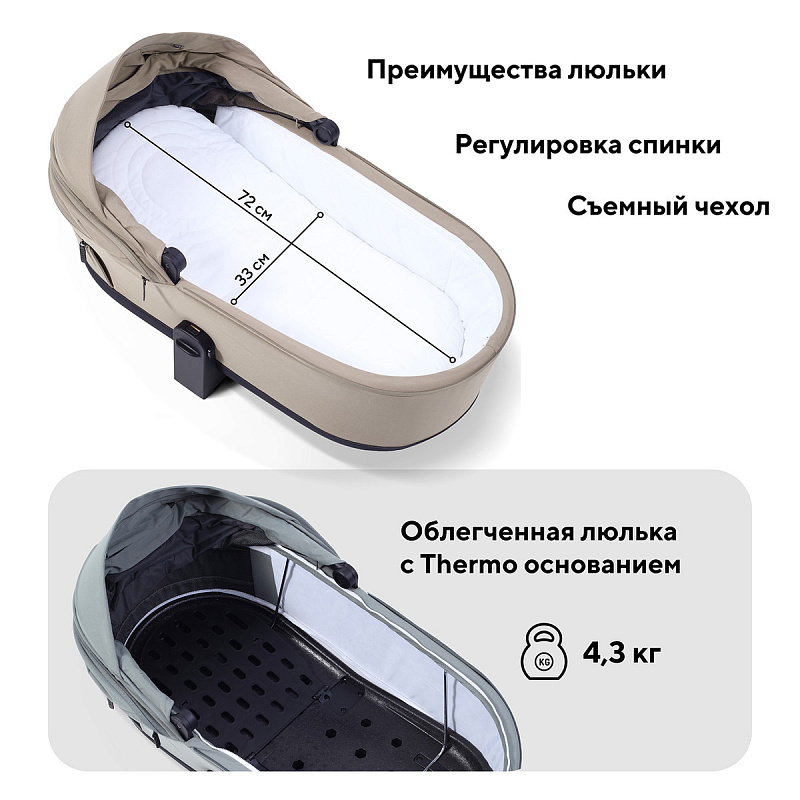 Термолюлька: дно выполнено из специального материала — лёгкое, прочное и термоизолирующее. Обеспечивает комфорт в любую погоду: летом не перегревается, сохраняет циркуляцию воздуха; зимой сохраняет тепло. Подойдёт как для прогулок, так и как временная кроватка при посещении гостей.
