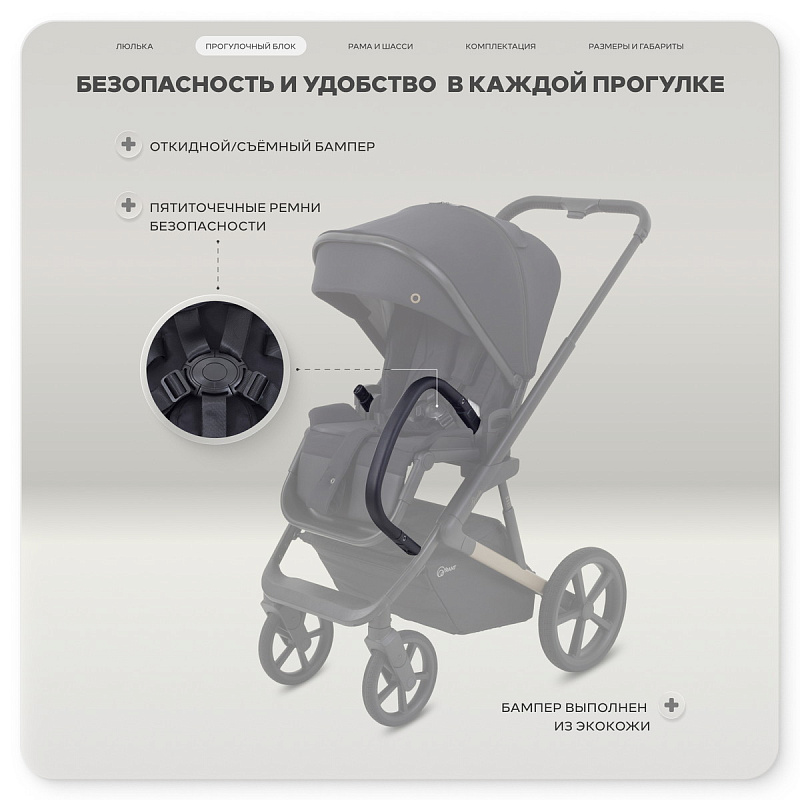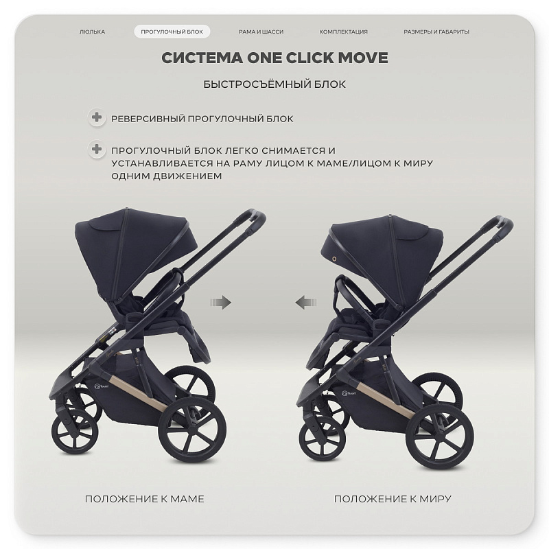 быстросъемная люлька (система One Click Move) в этой модели дополнена кнопками памяти, что позволяет непринужденно снимать спальный блок одной рукой