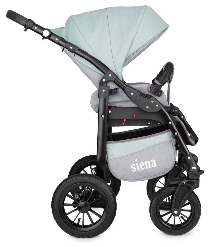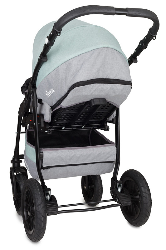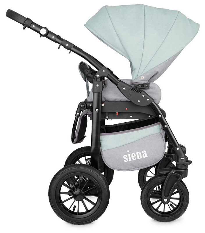 Коляска 2 в 1 дополнена вместительной корзиной для покупок и сумкой для мамы. Резиновые надувные колёса с амортизацией, передние поворотные, с повышенной маневренностью. Ножной тормоз с одной педалью.