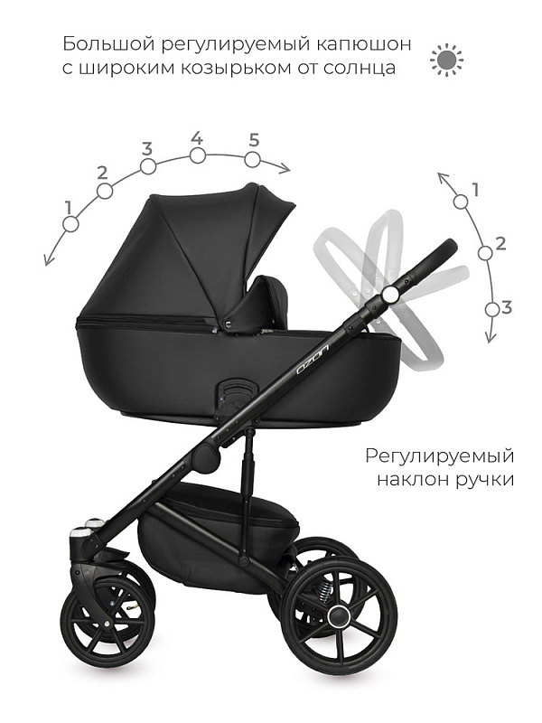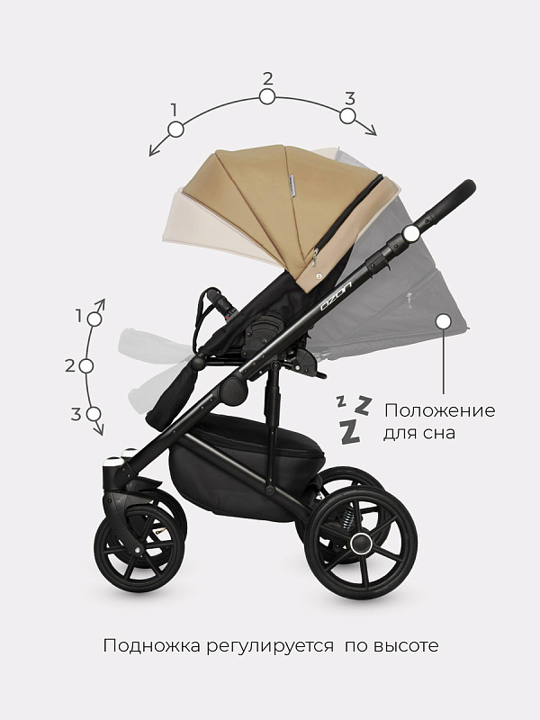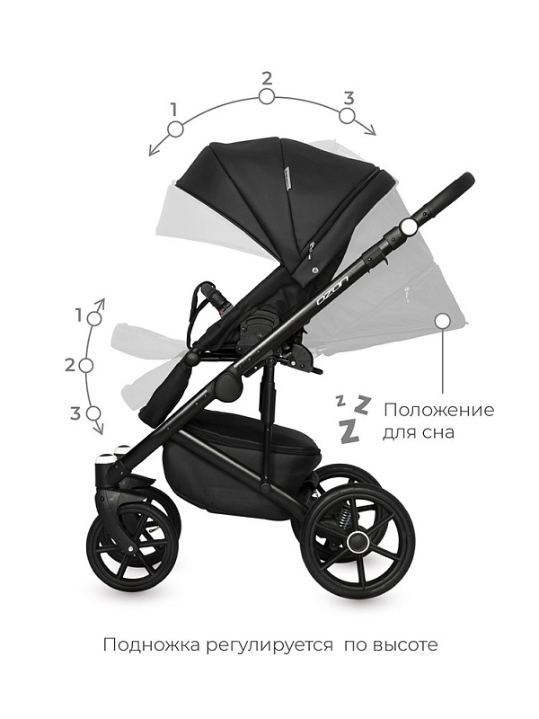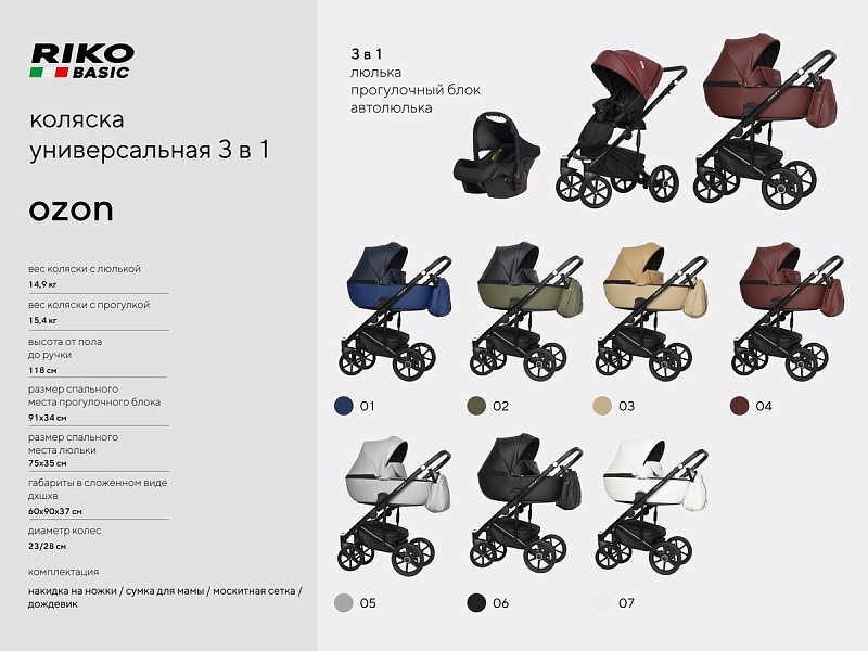 Для комфортных прогулок и безопасных путешествий в авто купите детскую коляску Riko Basic Ozon 3 в 1. 3 съемных взаимозаменяемых модуля, стильная и практичная обшивка из эко-кожи, маневренные и мягкие в ходу колеса – передние литые, задние резиновые надувные
