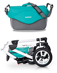 - Коляска снабжена регулируемой ручкой, на которой есть карабины для фиксации родительской сумки.